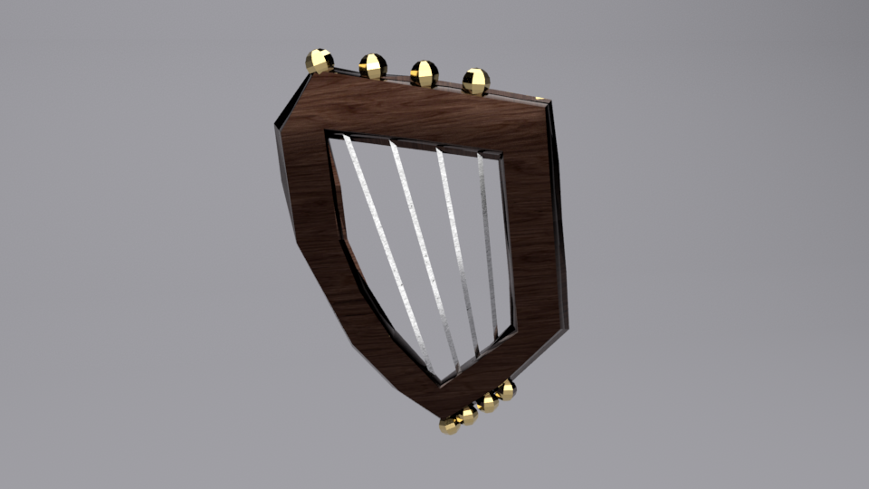 I then created 4 cylinders and made them as small and thin as possible for the strings. I then added spheres on the ends of these to make it seem as though they were pinned into the wood of the harp.