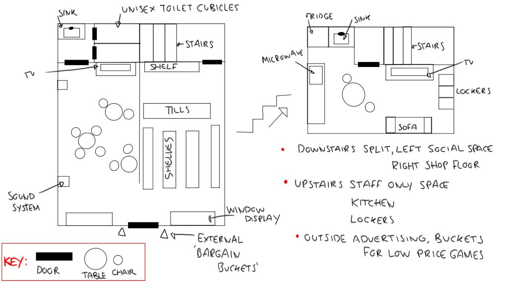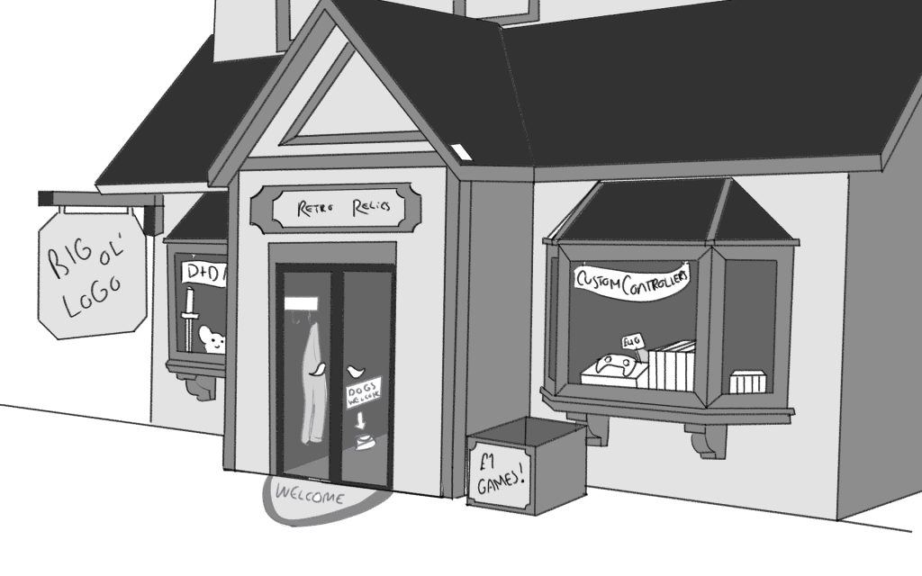 Outside we have bargain buckets for cheaper games, shelves inside on the right for holding games, game merchandise and consoles. Behind the counter I made sure there was a shelf for holding more expensive items to keep them safe from dust.
