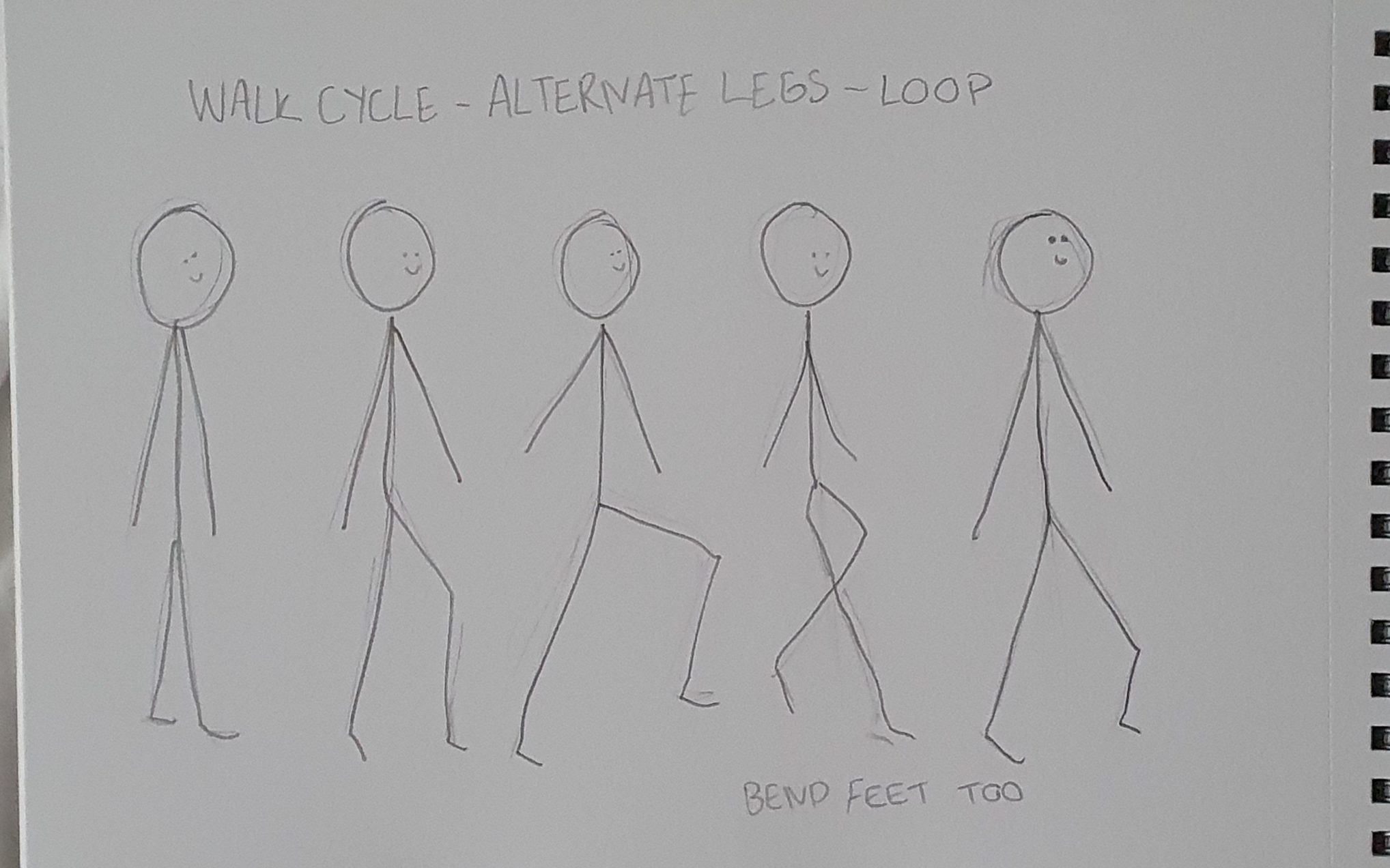I created some storyboards to plan out my animations, the first one is some emotes, waving, jumping, sitting and eating. The second is a walk cycle, which I planned the legs out on paper very simply intending to use it as reference. I tried to imagine the alien model as a little creepy guy that just happened to be sharing the same environment as my original character. I really loved my own character and I wish I could have used him. But I learned a lot about how to form a model ready to be rigged and used for animation now, and that my pc needs to be a lot more powerful to work with such a detailed model!