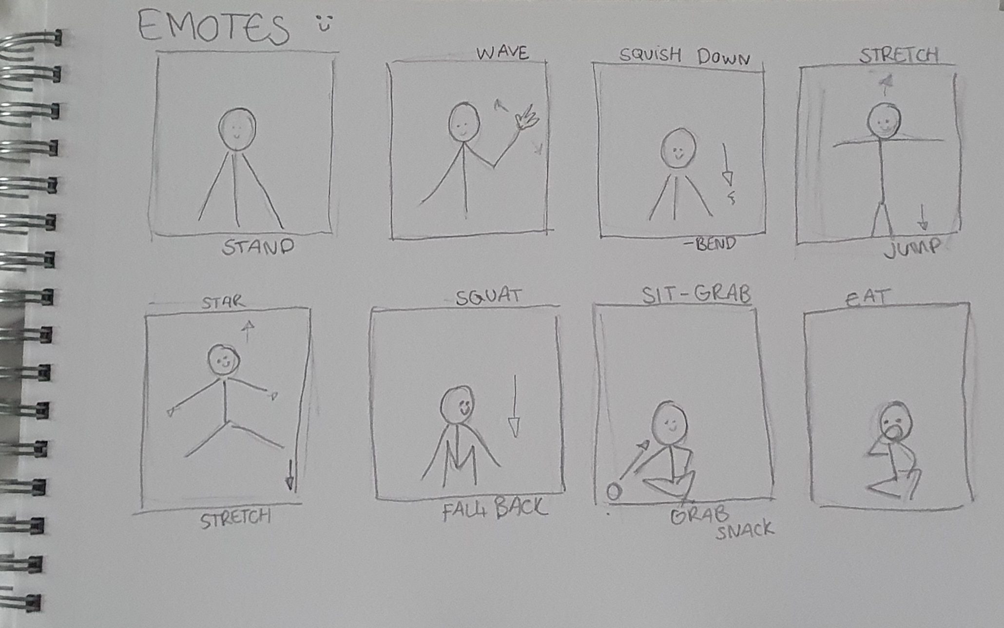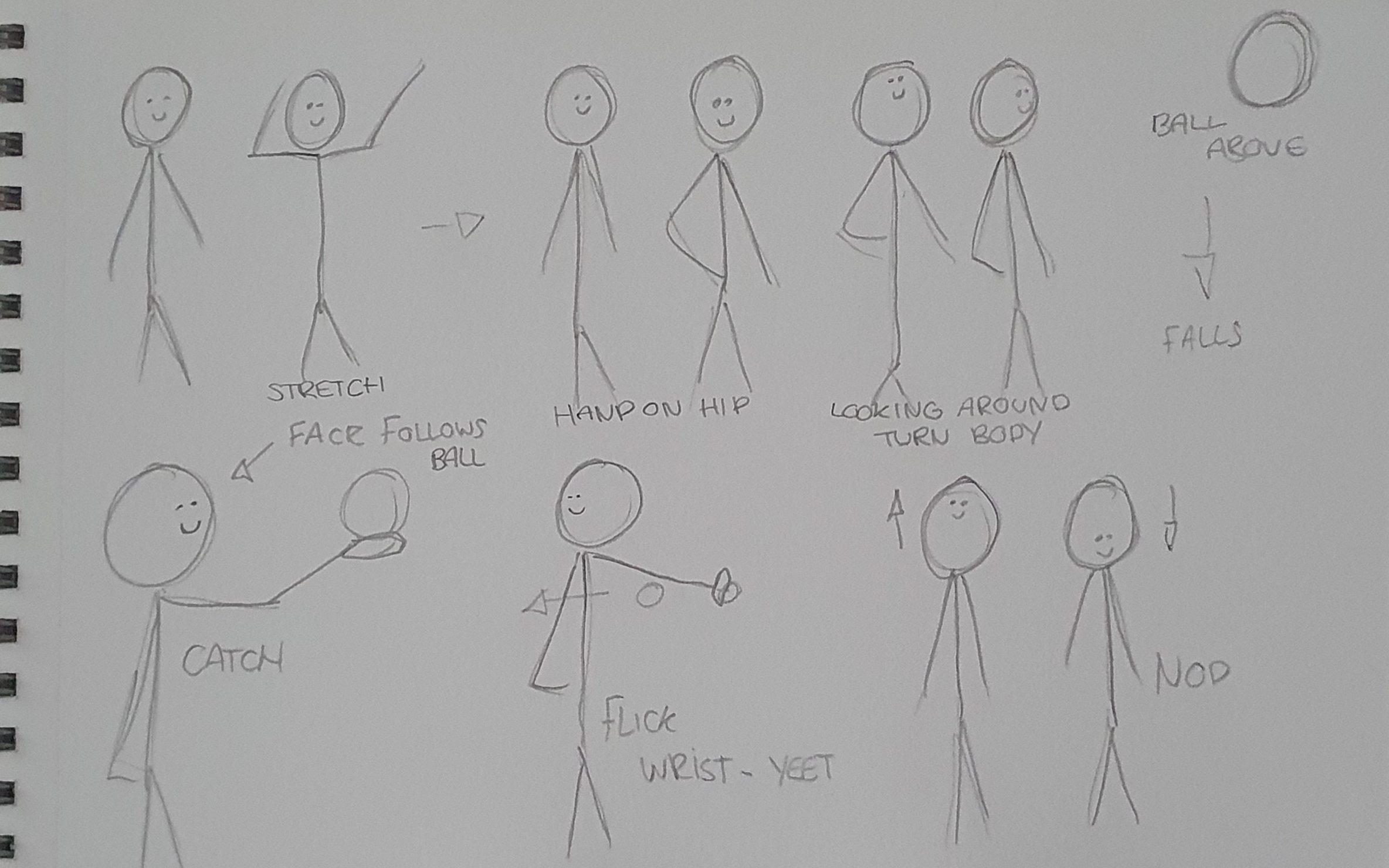 The final one will be idle animations, which seem simple but bring a lot of life to the character, and catching and throwing a ball as I really wanted to try it. I made the storyboards on paper because it was more convenient and felt more natual than pulling out a tablet and drawing in a program that neatened or smoothed the lines for me. It helped me see where I meant for things to be fluid even though it was just stick men.