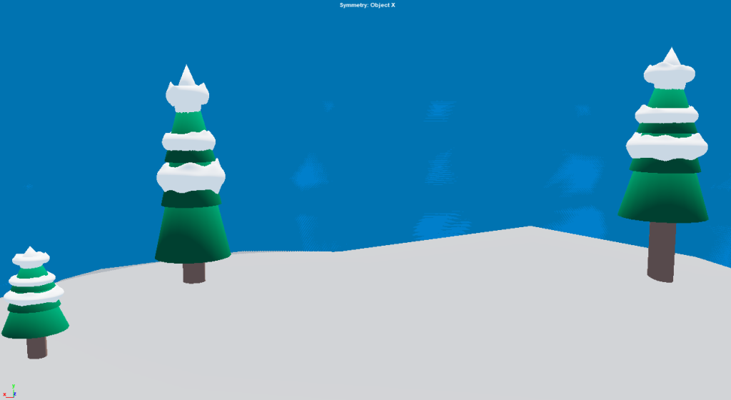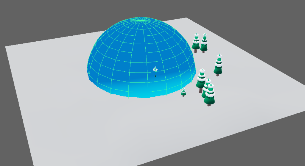 For a skybox I literally just made a giant ball and turned it inside out and made it blue. Looks a bit like a snow globe. I didn’t use as much of my scene as I would have liked which is sad as I worked hard to make it feel snowy.